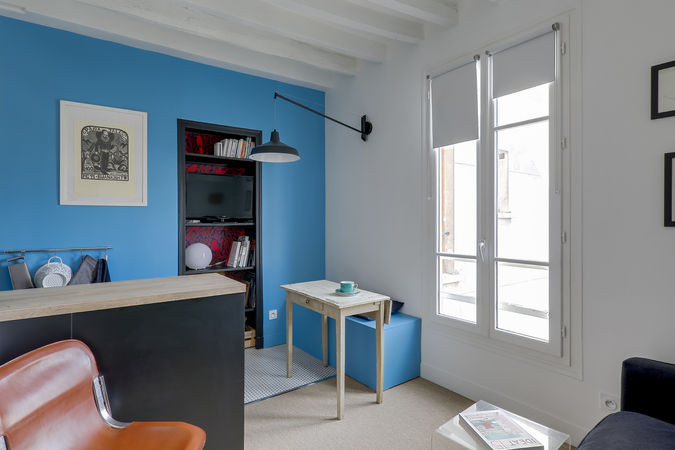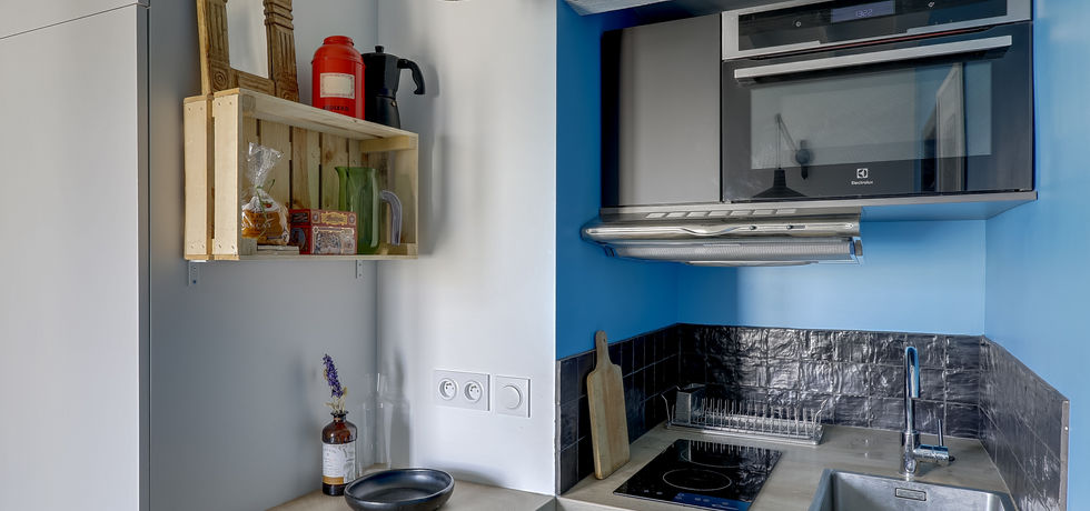 Un rayon de soleil bleu s'incruste dans cet appart lumineux. Le challenge était d'avoir tout le confort d'un logement dans 16m2, mais plus encore, de trouver une place pour une cuisine tout équipée avec une machine à laver ! (je vous le dis d'avance, le défi a été relevé)